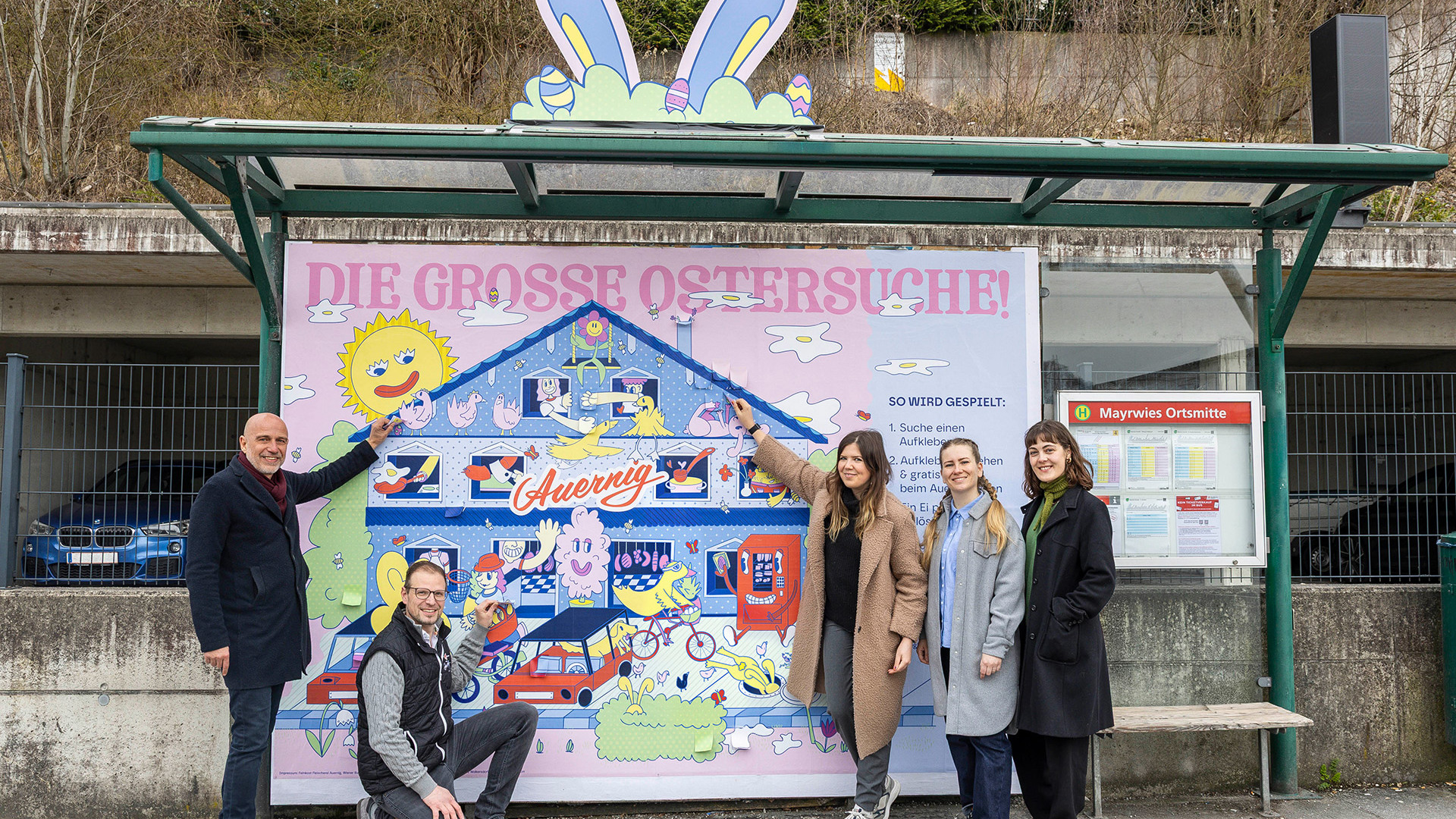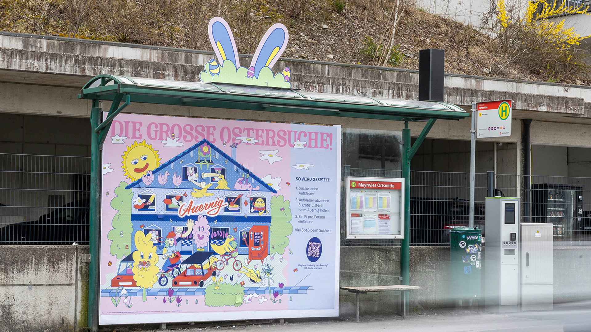 Das Wartehäuschen erhielt durch eine Formatsprengung überdimensionale Osterhasenohren und Ostereier, die das Motiv räumlich erweitern und hohe Sichtbarkeit erzeugen. Das Wimmelbild wurde großflächig integriert und um ein interaktives Element ergänzt: Einzelne Ostereier im Sujet wurden durch Sticker verdeckt, die Passantinnen und Passanten abziehen konnten. Auf der Rückseite befand sich jeweils ein Gutschein für ein kostenloses Osterei bei Auernig. Damit wurde die Bushaltestelle zu einem spielerischen Erlebnisort mit direktem Anreiz zum Besuch des Geschäfts.