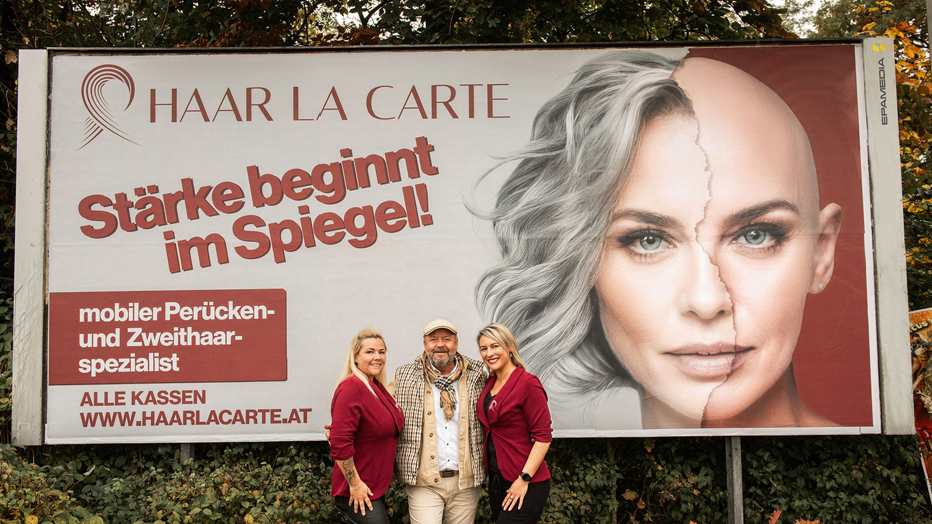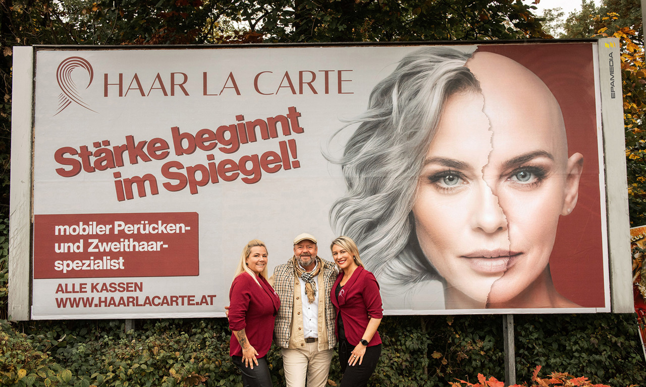 Der mobile Perücken- und Zweithaarspezialist Haar la carte ist ab sofort auf rund 30 Plakatwänden in Kärnten präsent. Mit starken Botschaften wie „Stärke beginnt im Spiegel“ und „Mut steht dir gut!“ möchte das Unternehmen Menschen mit Haarverlust Mut machen und informieren.