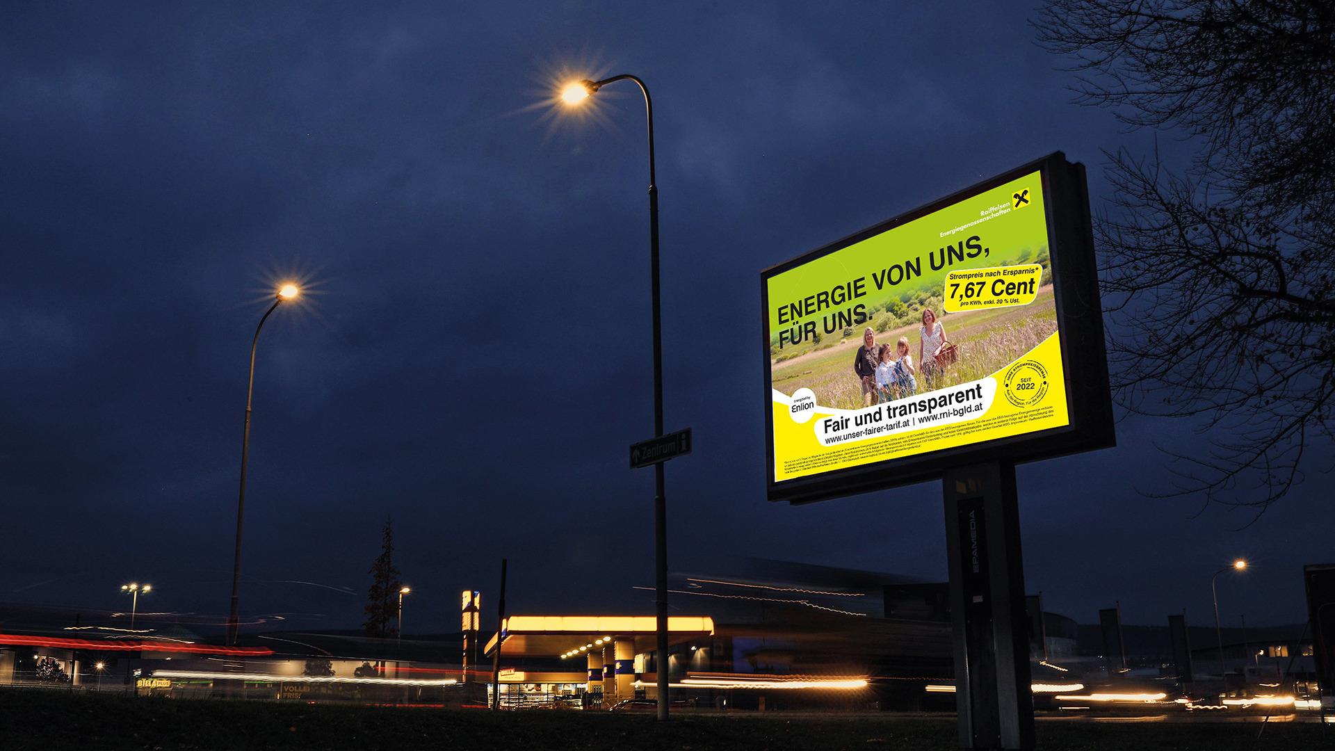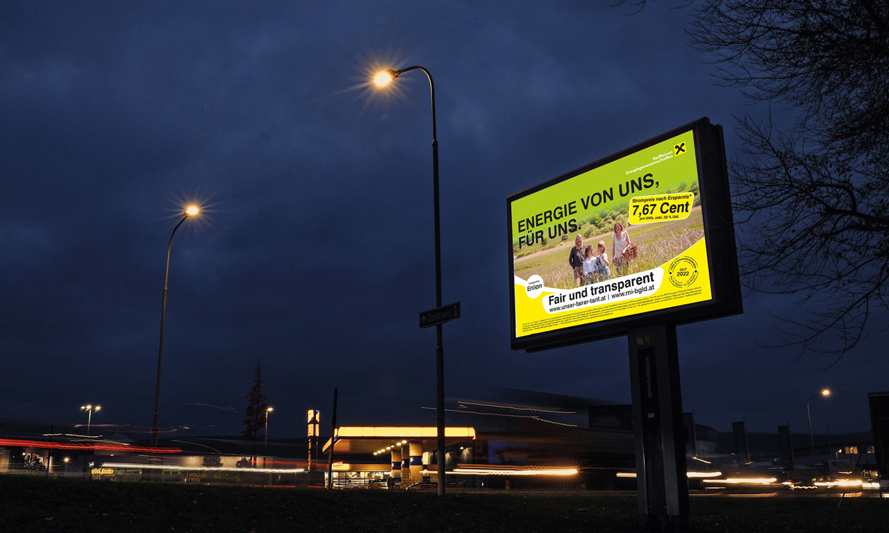 Mit einer landesweiten Out-of-Home-Kampagne auf Plakat und Digitalen Posterlights macht Raiffeisen Burgenland auf ein zukunftsweisendes Projekt aufmerksam: die Raiffeisen Energiegenossenschaften. Als Werbeträger sorgt EPAMEDIA für hohe Sichtbarkeit im gesamten Burgenland. Unter dem Motto „Energie von uns, für uns“ steht das Modell für gelebte Gemeinschaft, regionale Wertschöpfung und nachhaltige Energieerzeugung. Die 16-Bogen-Kampagne wird burgenlandweit ausgespielt und durch digitale Posterlights in Eisenstadt verstärkt.